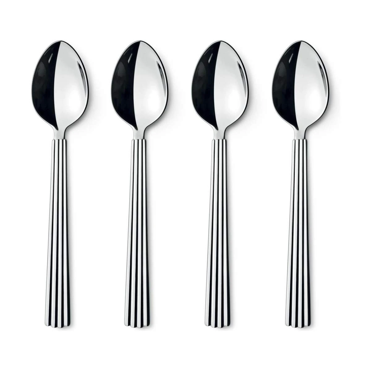 Din kaffe eller te bliver lidt mere elegant, hvis de serveres med en Bernadotte teske fra Georg Jensen. Teskeen er den perfekte accessory til morgenbordet, da du også kan bruge den til dit blødkogte æg eller din yoghurt. Teskeerne sælges i en fin gaveæske med i alt 4 stk. De er udformet i rustfrit stål med de karakteristiske riller på skaftet, der også ses på de øvrige bestikdele fra Bernadotte-serien.